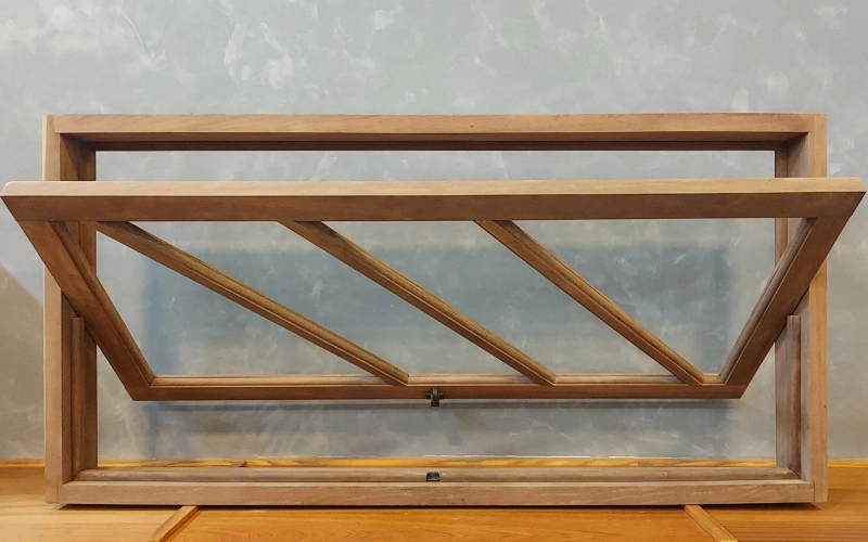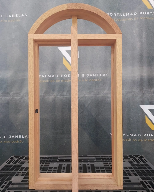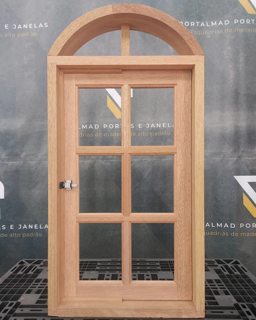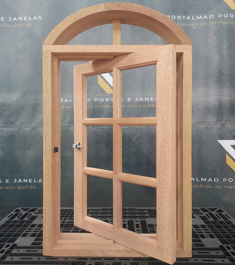 Ela é leve, funcional e muito prática, com um sistema de abertura suave. Pode ser produzida como janela pivotante de madeira com vidro, em módulos, ou janela vitrô pivotante de madeira — geralmente menor. Também existem variações fabricadas no formato de janela em arco, com venezianas, telas mosquiteiras, etc.