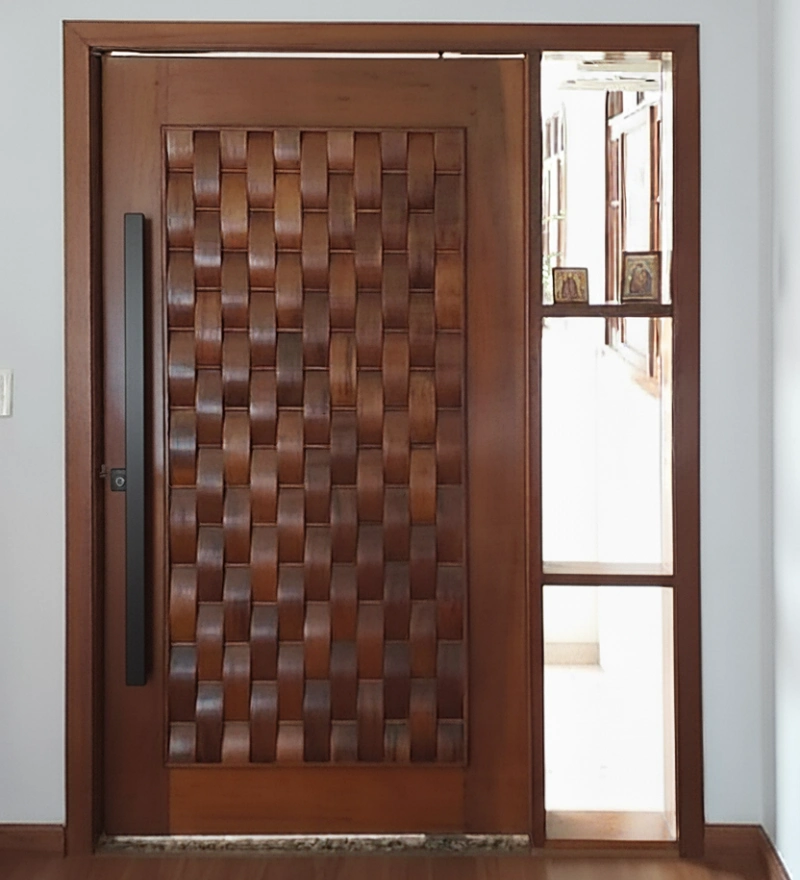 Além do visual refinado, essas portas de madeira maciça — ou portas sólidas — oferecem alta durabilidade e resistência ao uso diário, mantendo-se firmes e estáveis por décadas. Já as portas de madeira engenheirada, ideais para vãos maiores ou visores amplos, garantem leveza e reforço estrutural sem perder a robustez e o acabamento nobre que caracterizam a verdadeira madeira de qualidade.