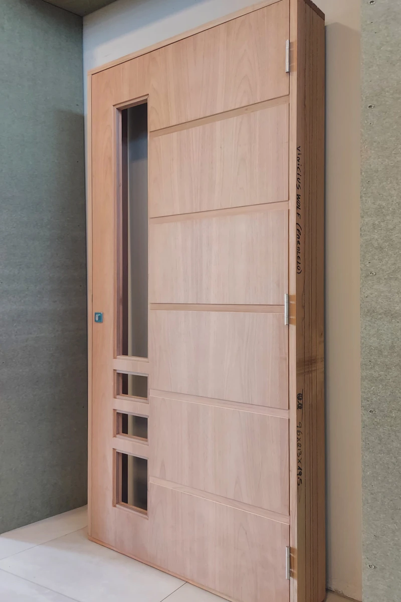 A porta com visor fabricada em madeira destaca-se pela textura única e pela beleza natural das fibras expostas, que valorizam qualquer ambiente com elegância e sofisticação. Cada abertura — exceto as opções para pintura — apresenta tonalidades e veios exclusivos.