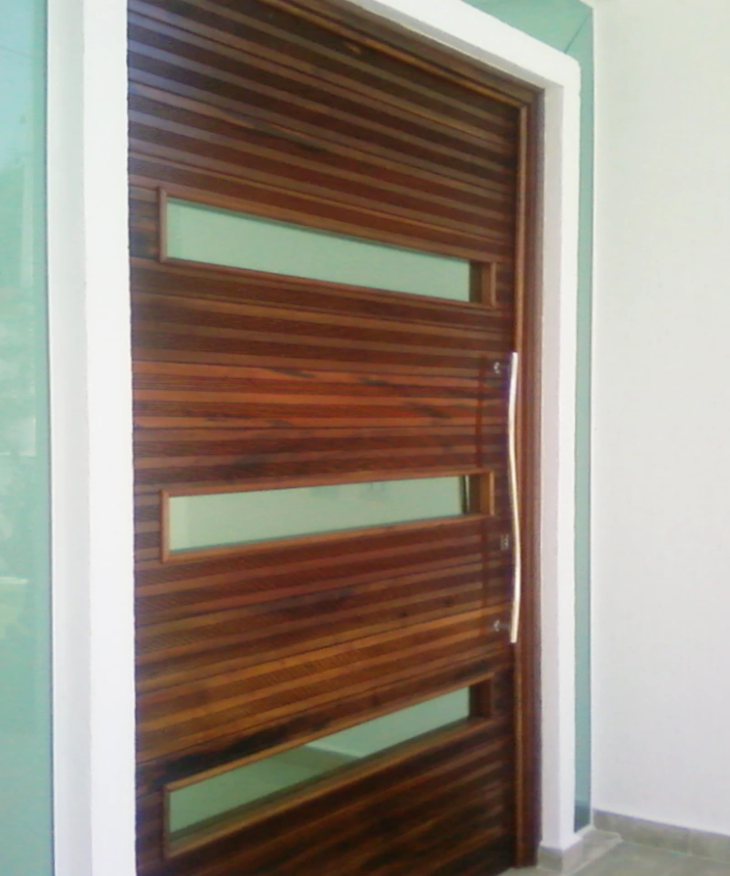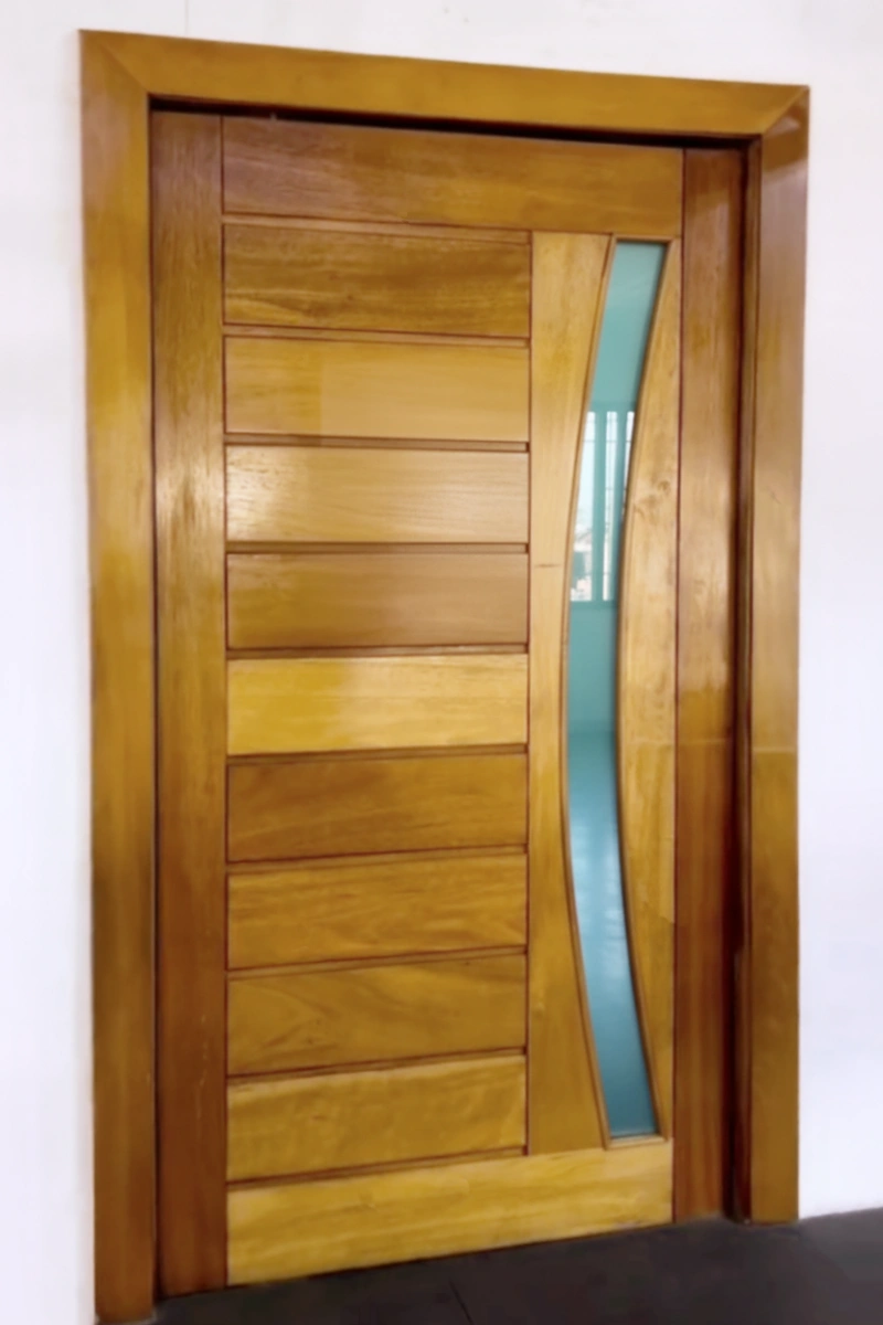 Os vidros variam quanto ao tipo — transparente, jateado, fosco ou colorido — oferecendo privacidade e iluminação adequada. Esse tipo de porta de madeira com vidro combina funcionalidade e estilo, valorizando qualquer ambiente com elegância e luminosidade natural.