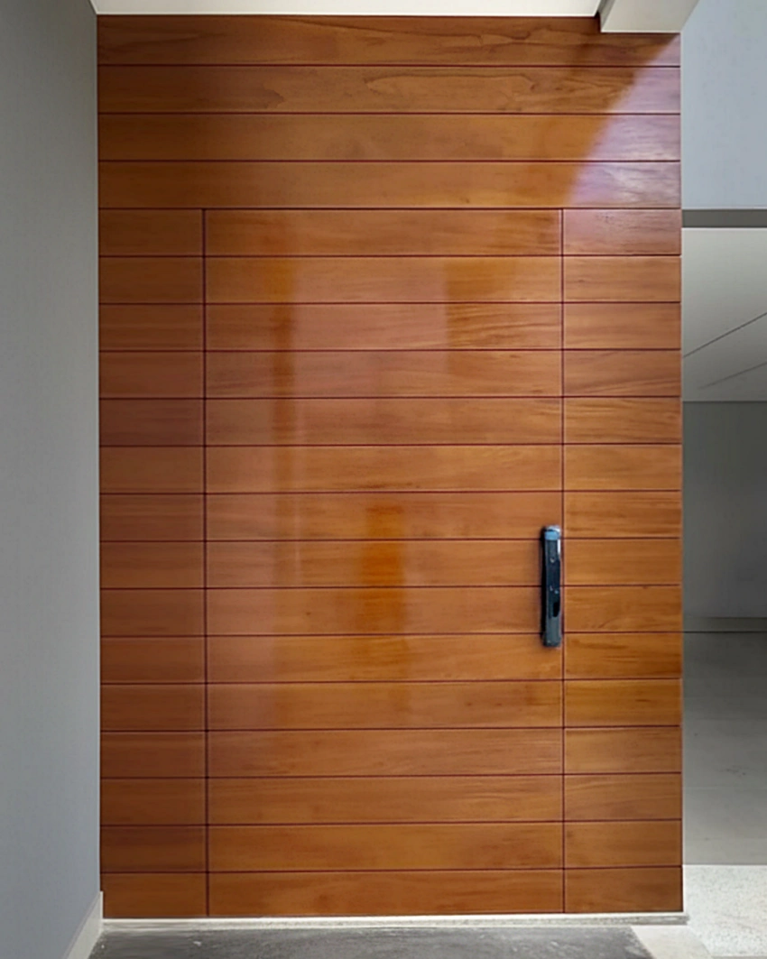 Os revestimentos ou aplicações de outros materiais podem fazer toda a diferença quando se requer uma porta de entrada de madeira com cores ou texturas fora de padrão. Entre em contato com a Portalmad e solicite todas as opções de materiais disponíveis ou sob encomenda.