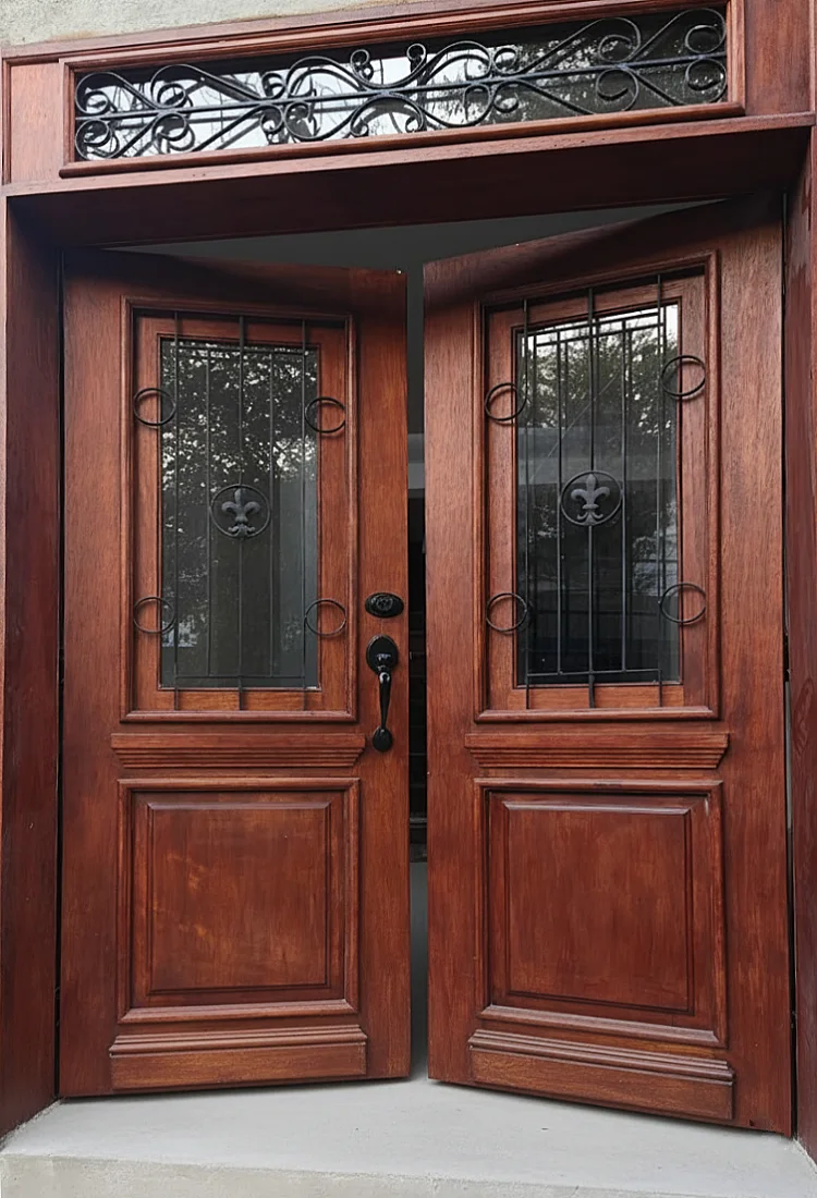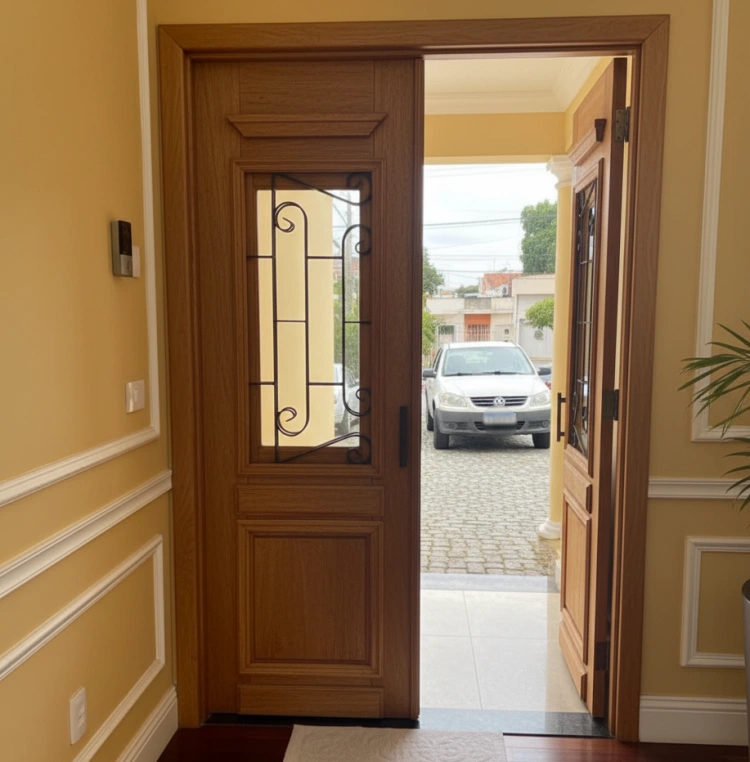 É possível fabricar portas pivotantes de madeira com a instalação de barras decorativas e protetivas de ferro ou outros metais.