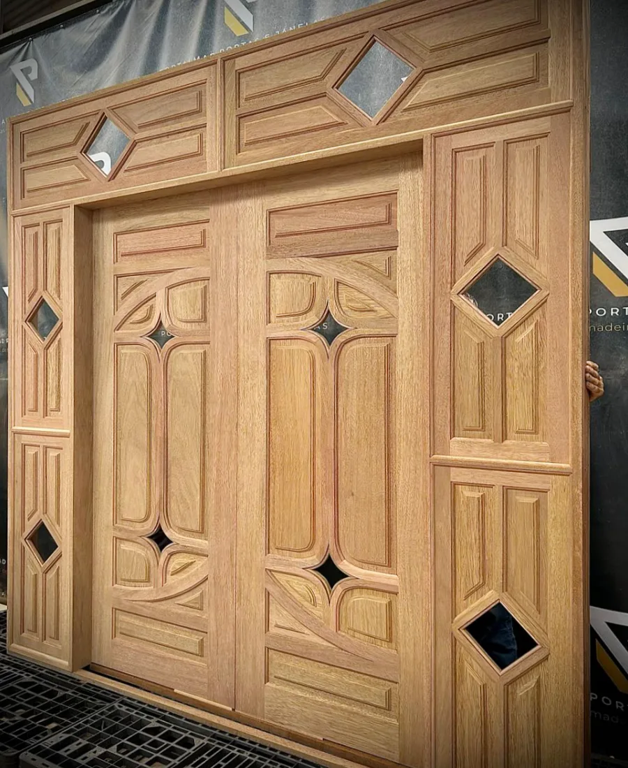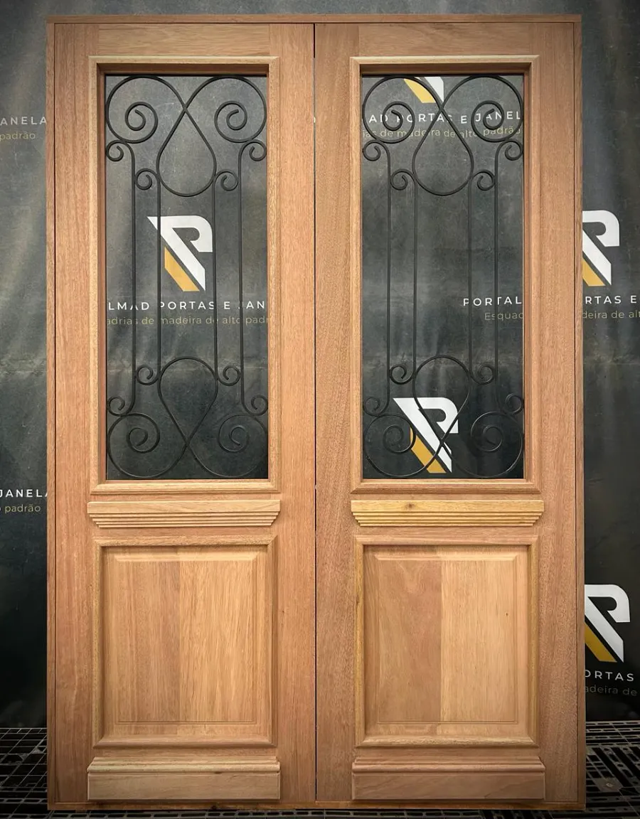 Uma porta dupla de entrada de madeira maciça pode ter produção na versão portal de madeira com vidros integrados, permitindo vidros dos dois lados para melhorar a iluminação. Os vidros também podem ser foscos, a fim de garantir mais privacidade.