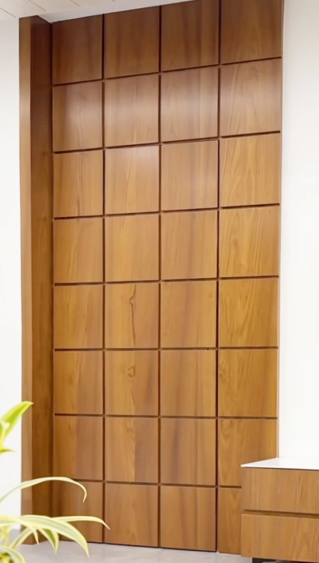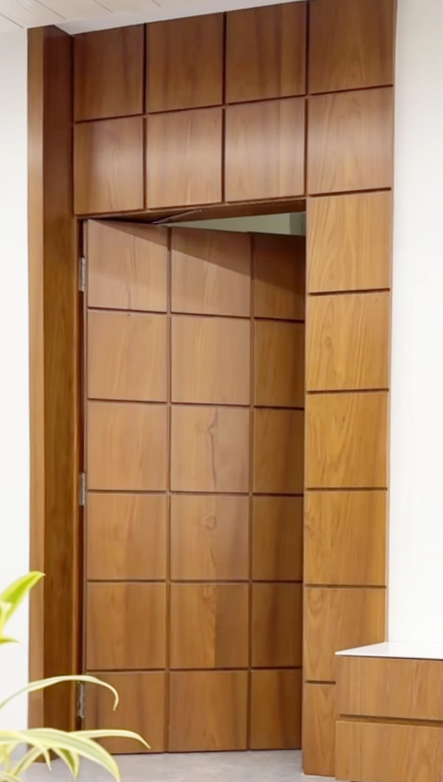 A porta oculta de madeira tem outra vantagem estética: as dobradiças, pinos e demais ferragens podem ficar escondidas. Isso permite uma aparência elegante e sofisticada, destacando principalmente a beleza e a textura da madeira.