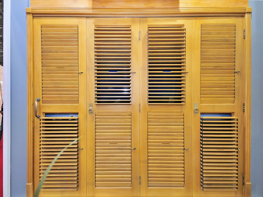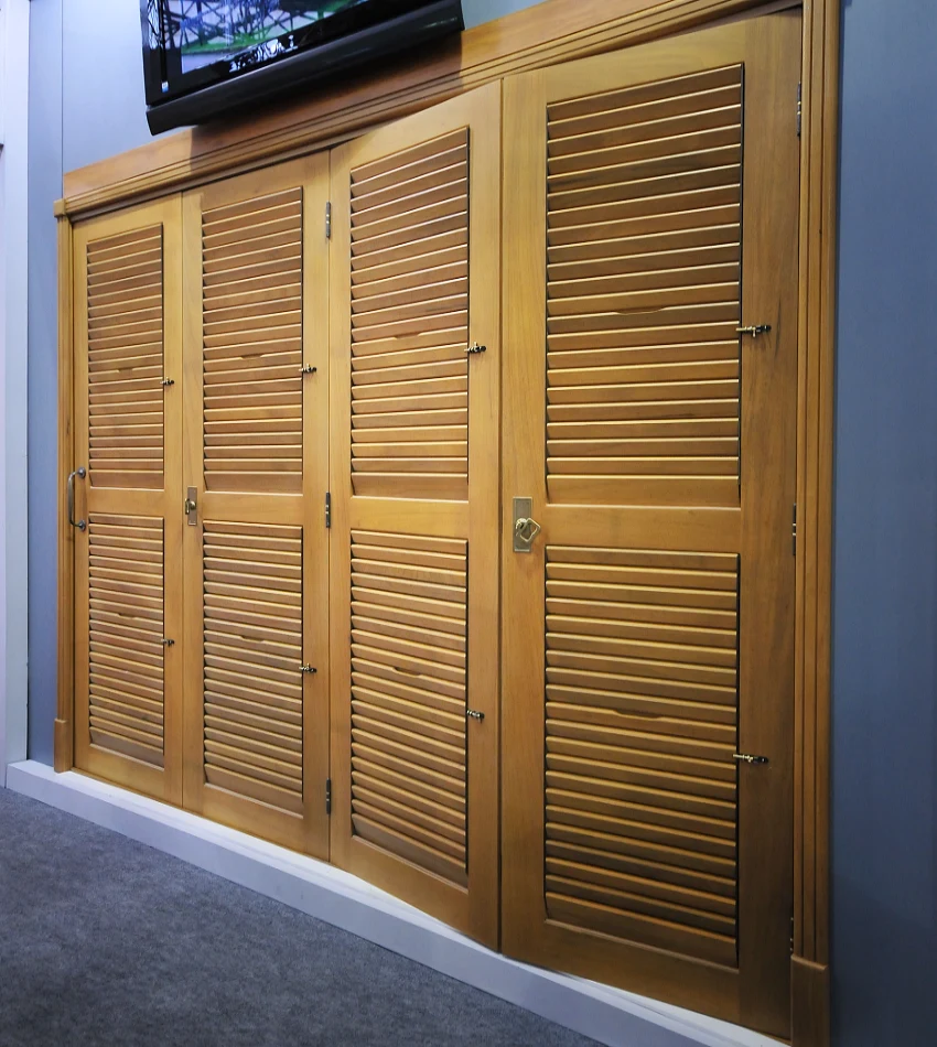 A porta veneziana de madeira com sistema de palhetas móveis, apresenta acabamento de altíssimo padrão e um funcionamento perfeito: prático, leve e suave.