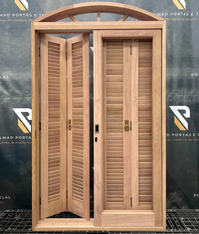 - Todas as portas com venezianas móveis — articuladas — são fabricadas com madeira rigorosamente selecionada e entregues com acabamento premium de alto padrão. As ferragens são especiais, fabricadas e dimensionadas pela Portalmad para cada projeto, nas medidas exatas, garantindo funcionamento perfeito.
