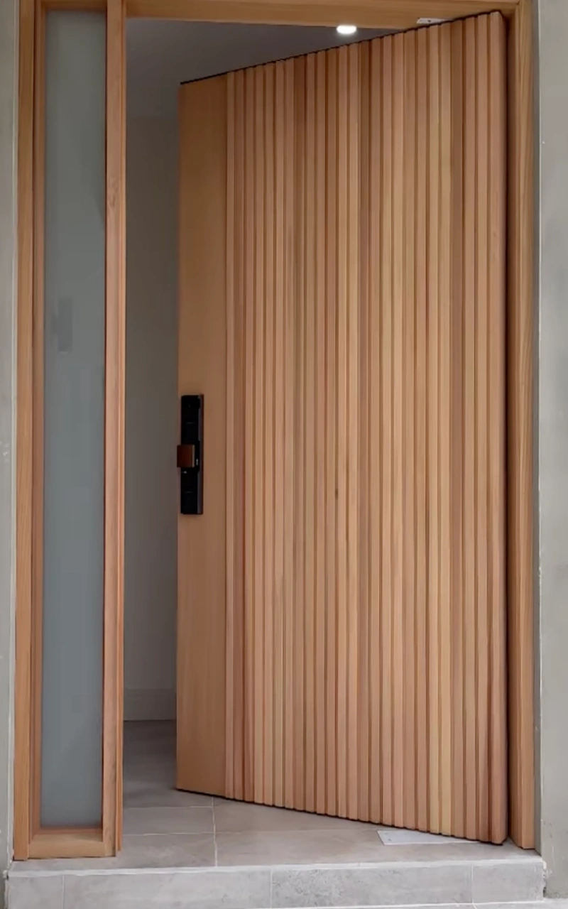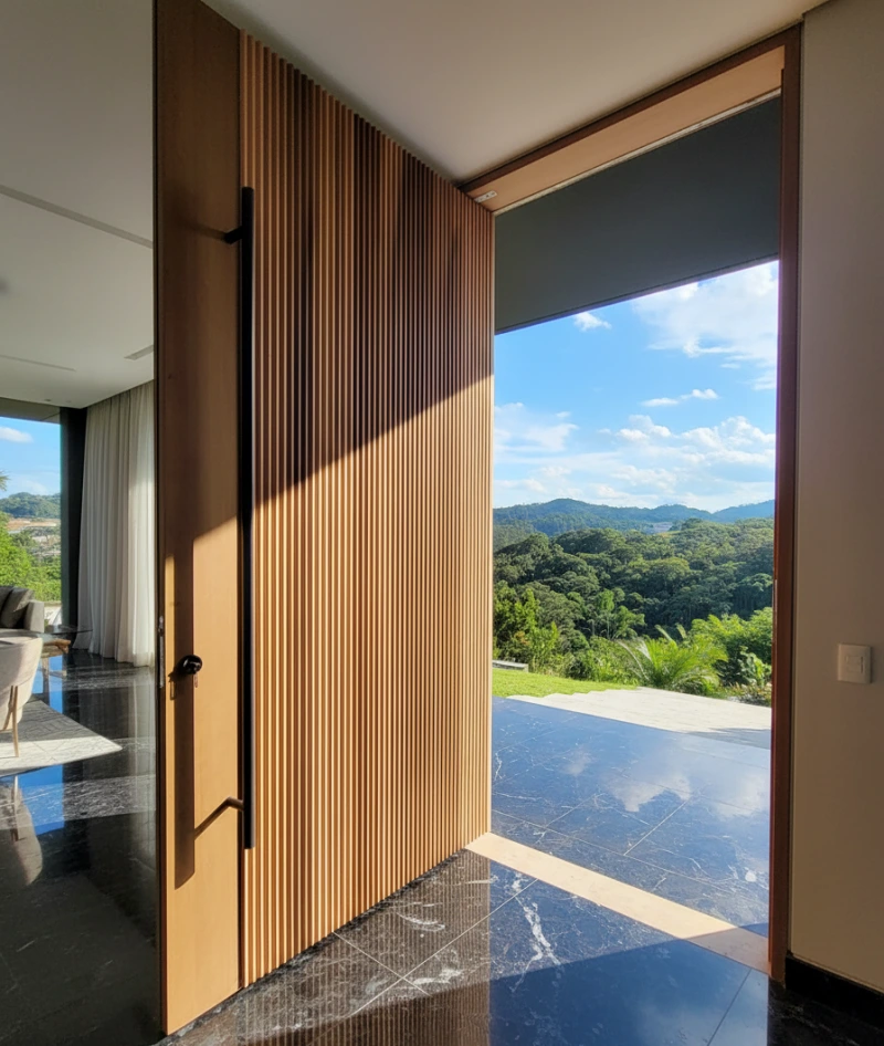 A porta ripada de madeira é uma tendência crescente na arquitetura e decoração, oferecendo sofisticação, beleza, funcionalidade e alta durabilidade aos ambientes externos e internos. Seu uso é versátil, pois a porta ripada combina com painéis fixos e também pode servir como divisória para integrar ou separar espaços conforme necessário.