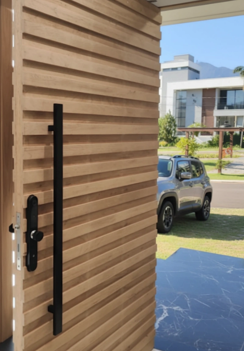 Versatilidade estética: as portas com ripas de madeira podem ser personalizadas para se adequar a diferentes estilos de arquitetura e decoração. Seja em fachadas de casas, escritórios ou espaços comerciais, elas entregam um toque de modernidade e elegância ao ambiente.